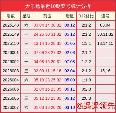开奖回顾:大乐透2026007开奖号码为01、03、13、20、26+03、10。其中012路比为1:2:2、无连号。